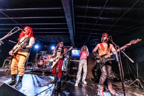 With the costumes done and songs learnt, I headed to San Luis Obispo to meet up with the band for rehearsals before the big, debut show. This where I got to meet my new bandmates, Matt LaPlant as Monkeywrench on sound and Andy Way of KMFDM fame on drums. I steeled myself for a new level of professionalism as we played to clicks with backing tracks and used in-ear monitors. I have to say, I LOVE in-ear monitors now. I went with Shure SE215 ear buds in limited-edition red to match my costume. We rented some Sennheiser monitor gear. I don’t need notes to know how to do pig squeals, but really the only way I could have possibly sang actual notes doing back ups in the band is with these in-ears.